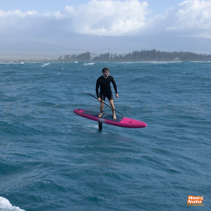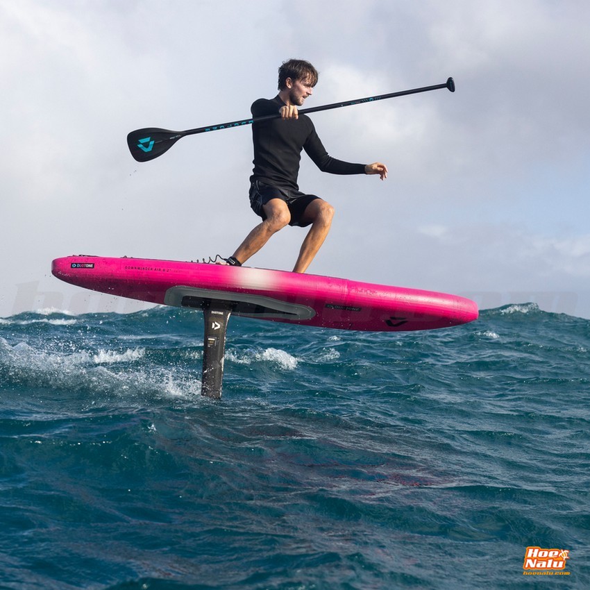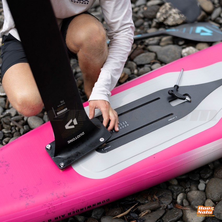 The Downwinder Air features a narrower and longer outline for maximum paddling speed and smooth downwind navigation, along with a longer carbon plate with an integrated foil box for a wide range of adjustment.