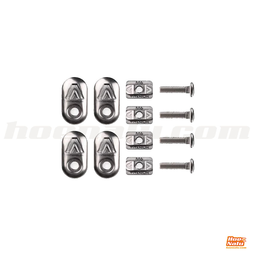 Incluye: 4 Tornillos Torx M6 de 25 mm de cabeza alomada de acero inoxidable 316L + 4 Tuercas en T de titanio M6 + 4 Arandelas bidireccionales de titanio
