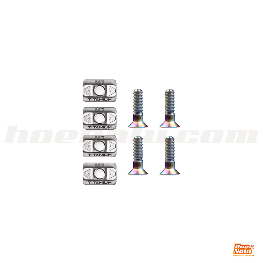 Incluye: 4 Tornillos avellanados Torx M7 de 26 mm de acero inoxidable 316L (revestimiento Rainbow Titanium) + 4 Tuercas en T de titanio M7